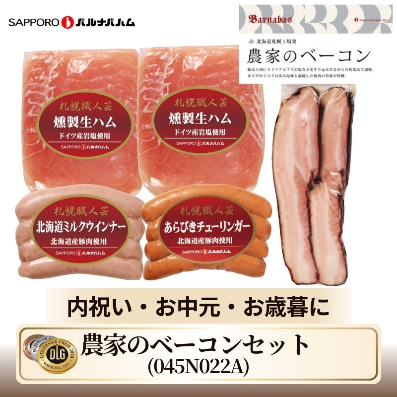 | 商品内容 | 農家のベーコンステーキカット 126g × 1、 北海道あらびきチューリンガー 100g × 1、 北海道ミルクウインナー 100g × 1、 燻製生ハム 40g × 2 |