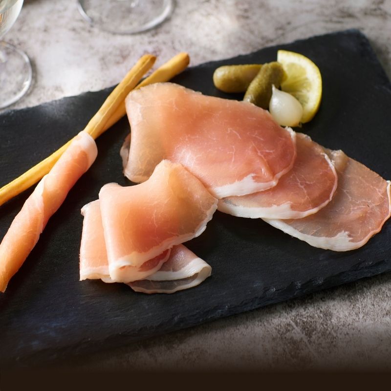 - 燻製の香りが豊かに広がるまろやかな塩味が特徴の生ハム